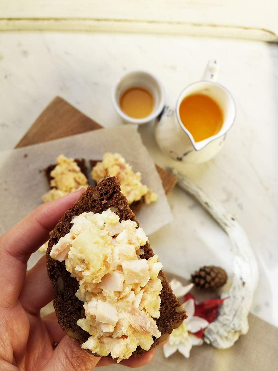 Por una lado picamos bien finos todos los ingredientes y los mezclamos. Para el huevo quitamos la clara. Mezclamos la sal y el azúcar e introducimos allí la clara durante 18 minutos. Pasado este tiempo la dejamos 5 minutos en agua para limpiar la sal y el azúcar.